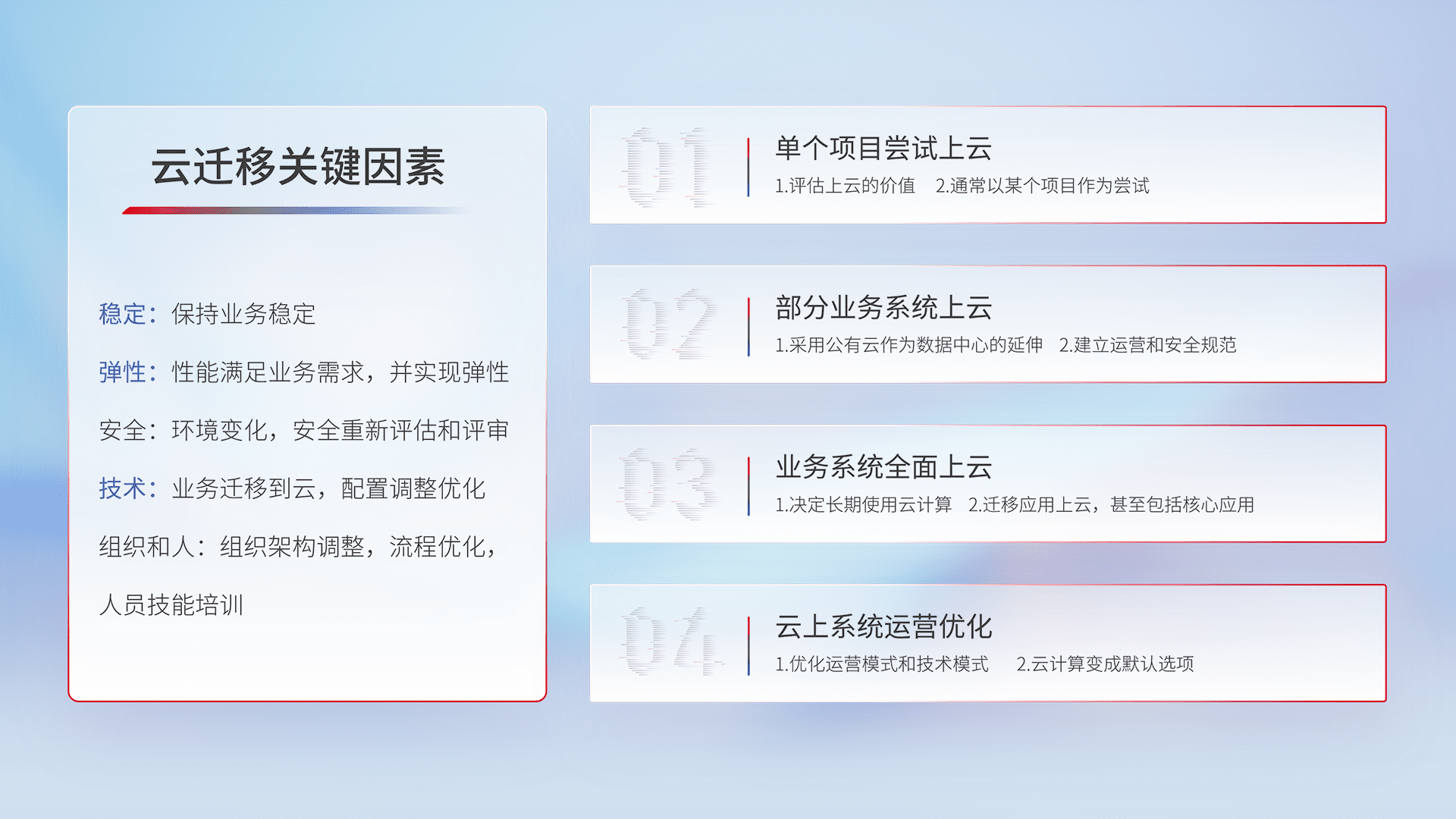 结合实际业务,,从规划设计、、、云平台选型、、、云原生改造、、、、数据迁移、、、集成交付,,,迁移全过程为客户识别最佳上云路径,,,做好风险识别管理,,设计网络架构、、、身份权限、、安全审计合规、、、操作审计、、、、日志审计、、、、监控告警策略、、、、多站点容灾设计等,,对云上基础设施进行整体规划,,,提升IT治理水平,,,以满足弹性、、、高可用、、、高性能的需求。。